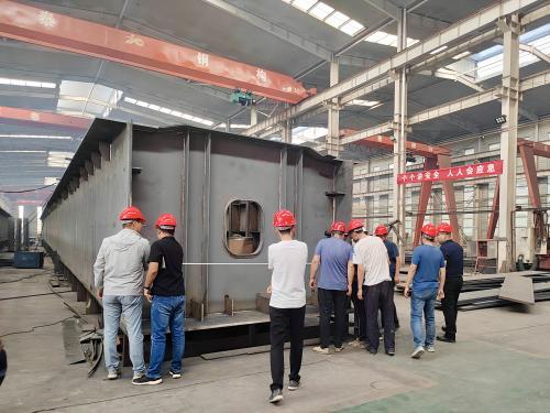 首先在車間觀摩了鋼箱梁的制作實(shí)況,客戶對鋼箱梁的焊接工藝、拼裝順序等方面事宜與我司范總進(jìn)行了深刻的交流,工作人員也將鋼構(gòu)件的制作拼裝進(jìn)展為客戶進(jìn)行了詳細(xì)匯報(bào)。